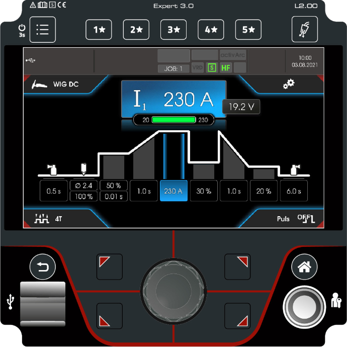 Alle wesentlichen Schweißfunktionen sind bei der Expert 3.0 Steuerung ohne zusätzliche Untermenüs direkt über den Homescreen erreichbar. Häufig genutzte Einstellungen lassen sich sofort anwählen und verändern.