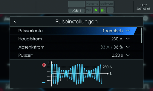 Bei der Einstellung von Puls‑ und Schweißparametern unterstützt die Expert 3.0 Steuerung den Anwender mit klaren, grafischen Visualisierungen. Veränderungen an Frequenz, Pulsstrom oder Balance werden direkt visuell dargestellt.